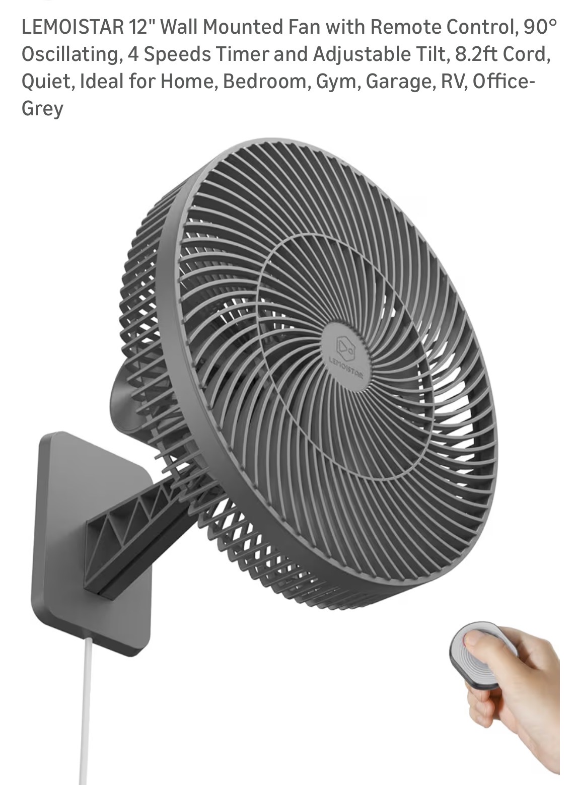 LEMOISTAR 12" Wall Mounted Fan with Remote Control #D156