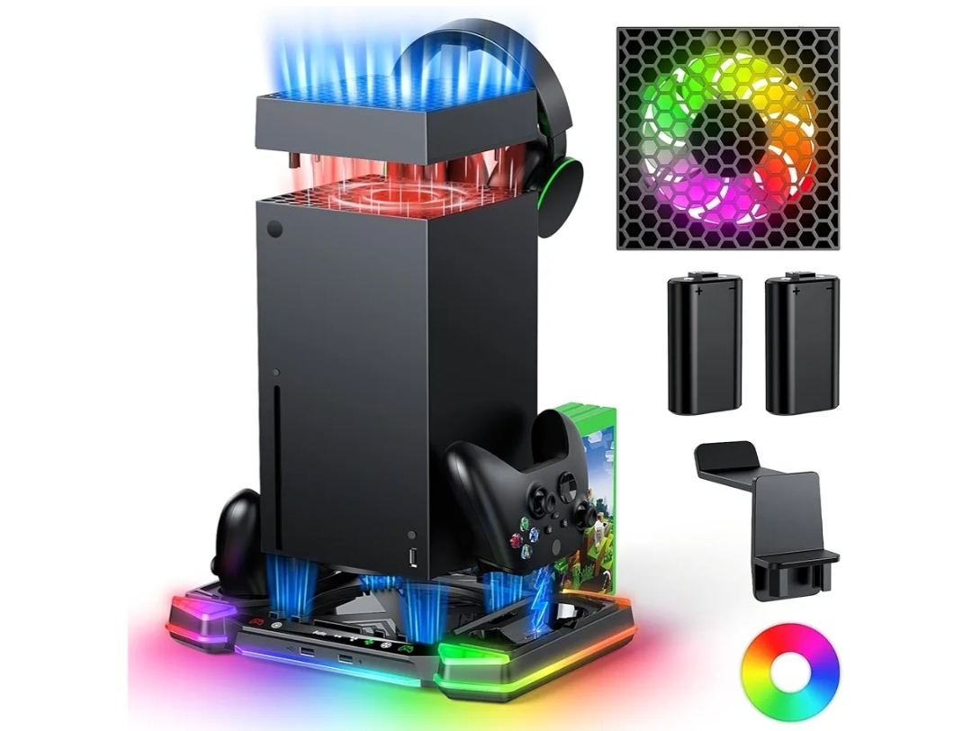 Ending On: 22/02/2026 07:23 Preview Time: 06:17 PMTop Auto Cooling Fan & Charge Stand for Xbox Series X Console with 11 Light Modes, Accessories Controller Wireless Charger Dock, 2*1400mAh Rechargeable Batteries, Headset Stand & Game Disc Storage