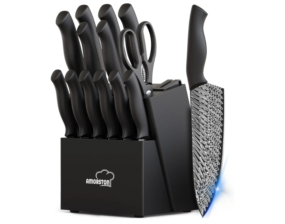 Ending On: 22/02/2026 07:27 Preview Time: 08:09 PMKnife Set, Amorston 15 Pieces Kitchen Knife Set with Built in Knife Sharpener, High Carbon German Stainless Steel Knife Block Set, Black Dishwasher Safe Knives Set, Valentine's Gift