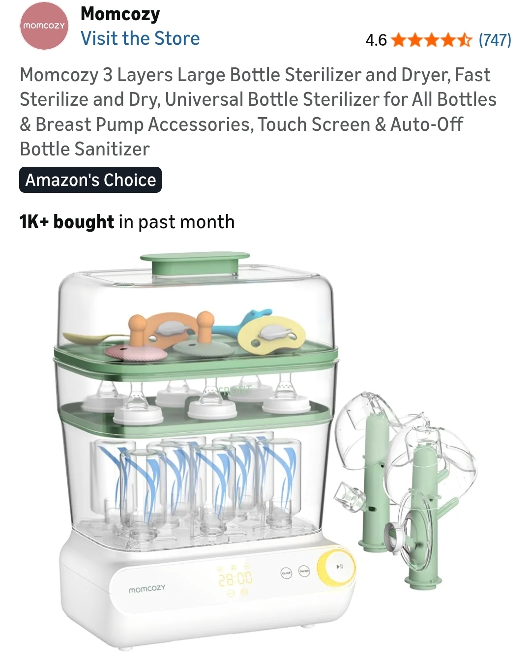 Ending On: 01/03/2026 07:16 Preview Time: 08:23 PMMomcozy 3 Layers Large Bottle Sterilizer and Dryer, Fast Sterilize and Dry, Universal Bottle Sterilizer for All Bottles & Breast Pump Accessories, Touch Screen & Auto-Off Bottle Sanitizer