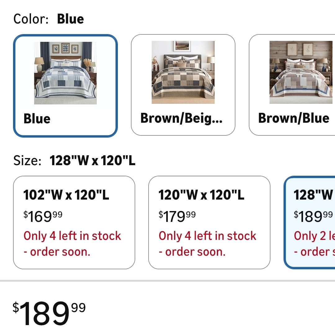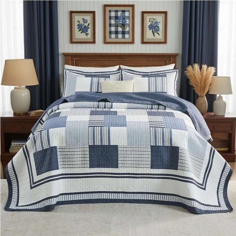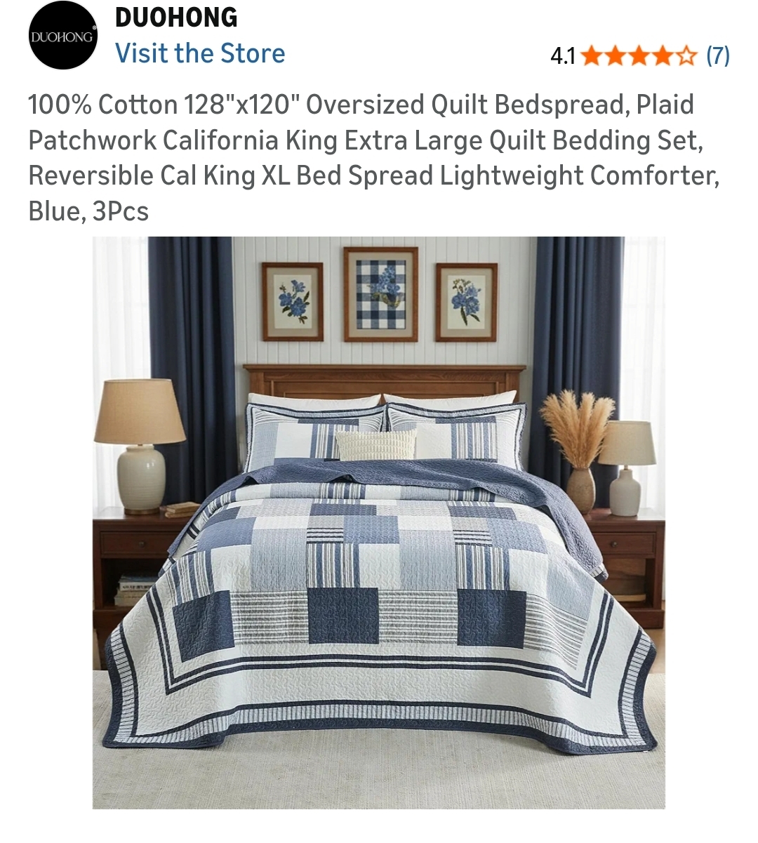 Ending On: 01/03/2026 07:16 Preview Time: 08:32 PM100% Cotton 128"x120" Oversized Quilt Bedspread, Plaid Patchwork California King Extra Large Quilt Bedding Set, Reversible Cal King XL Bed Spread Lightweight Comforter, Blue, 3Pcs