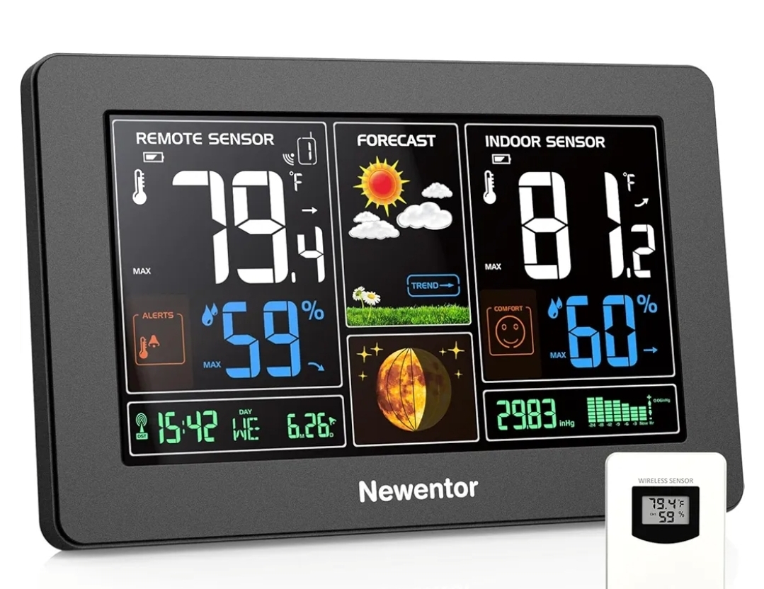 Ending On: 01/03/2026 07:21 Preview Time: 06:13 PMNewentor Weather Station Wireless Indoor Outdoor Thermometer, Color Display Digital Weather Thermometer with Atomic Clock, Barometric Pressure, Forecast Station with Adjustable Backlight, Black
