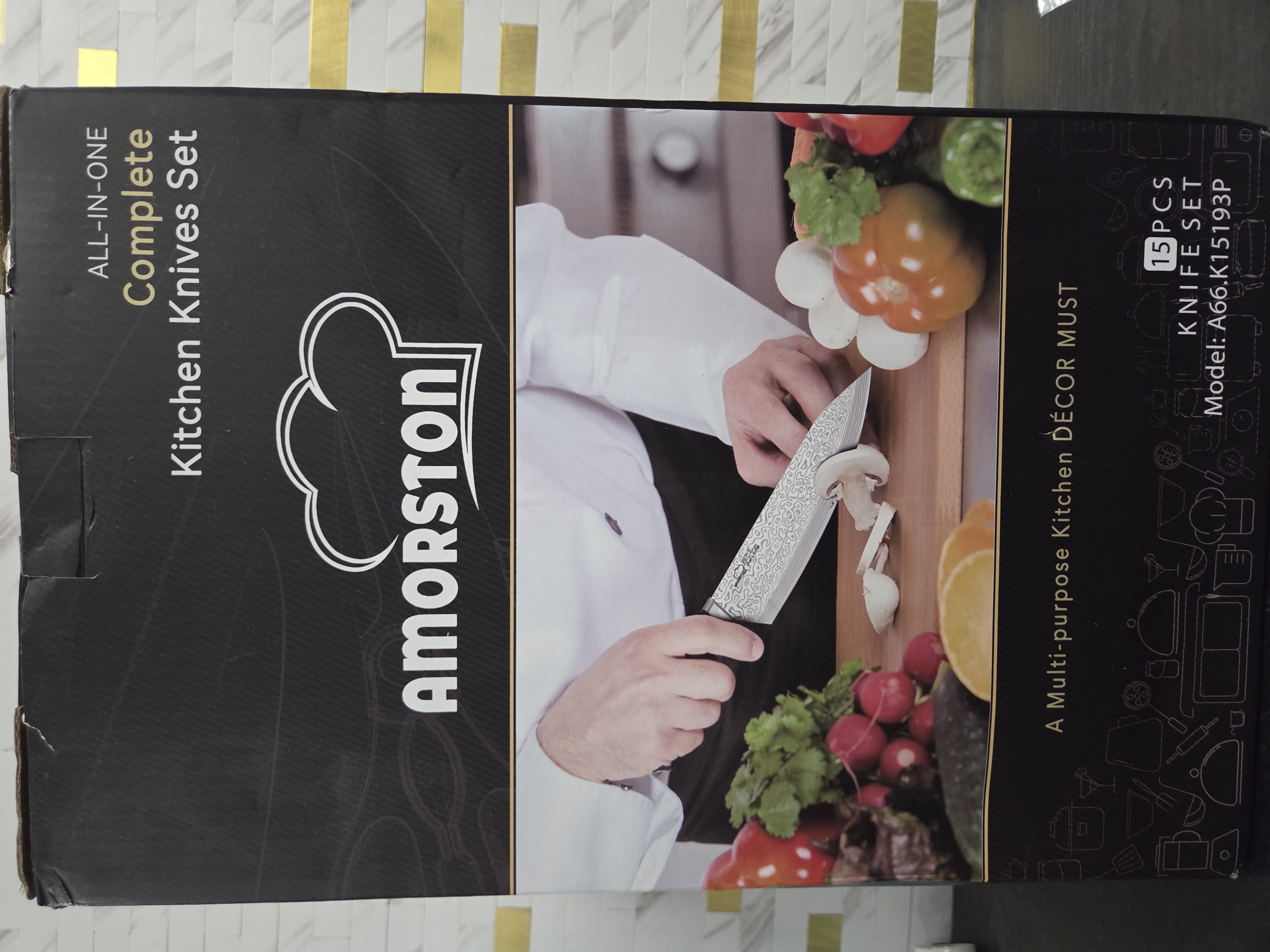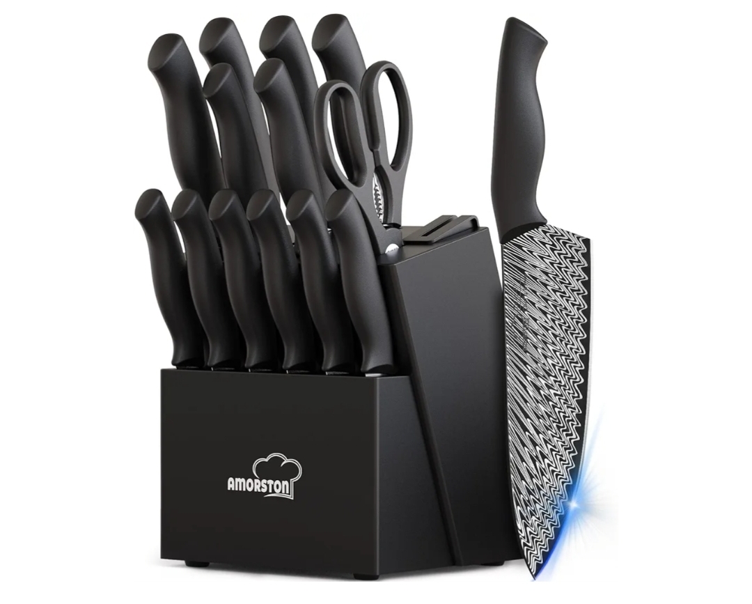 Ending On: 01/03/2026 07:29 Preview Time: 05:33 PMKnife Set, Amorston 15 Pieces Kitchen Knife Set with Built in Knife Sharpener, High Carbon German Stainless Steel Knife Block Set, Black Dishwasher Safe Knives Set, Valentine's Gift
