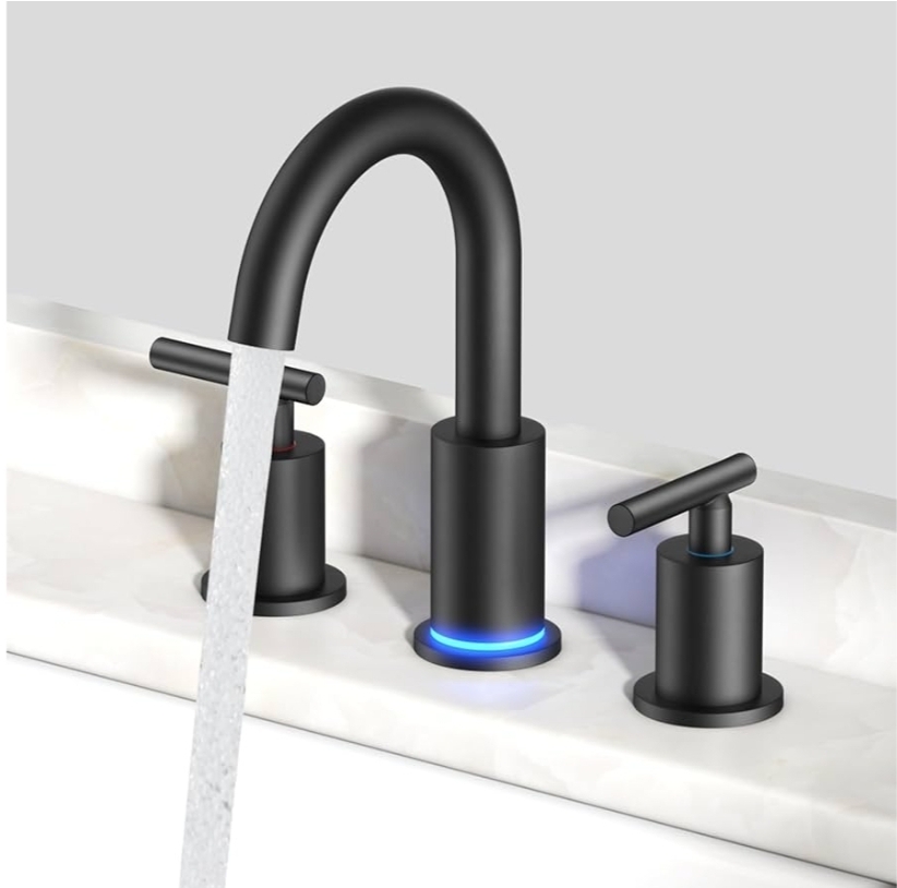 Ending On: 01/03/2026 07:40 Preview Time: 06:29 PMFORIOUS LED Bathroom Faucet Black 3 Hole with Temperature Changing 3 Color Lights, 8" Widespread Matte Black LED Bathroom Sink Faucet 3 Hole with Pop Up Drain, Supply Lines, 360° Swivel Spout
