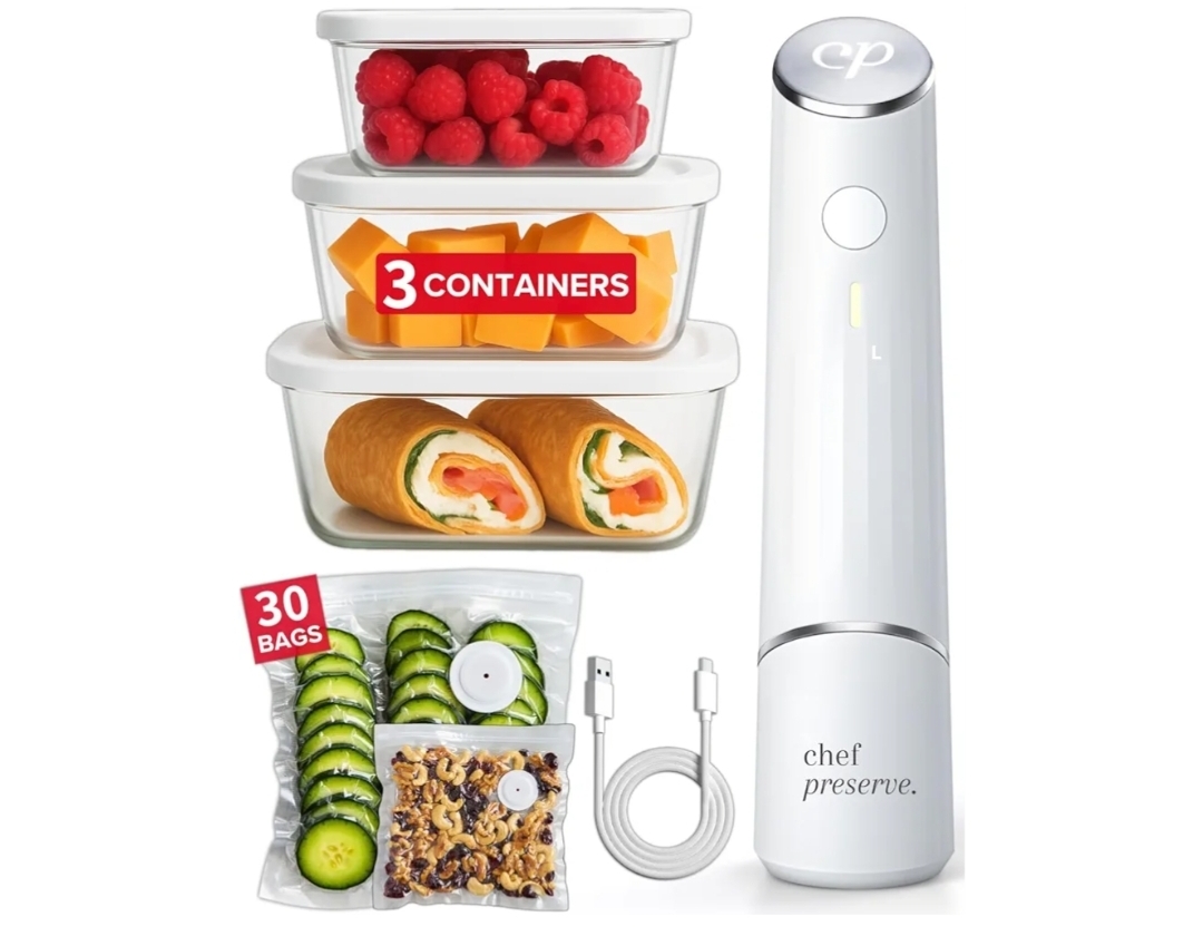 Ending On: 01/03/2026 07:41 Preview Time: 07:03 PMChef Preserve Compact Vacuum Sealer for Food (Vacuum Sealer Machine + 3 Glass Vacuum Containers + 30 Reusable Vacuum Bags) Powerful Handheld Vacuum Seal Machine, Seal Meal Saver, Portable Food Sealer