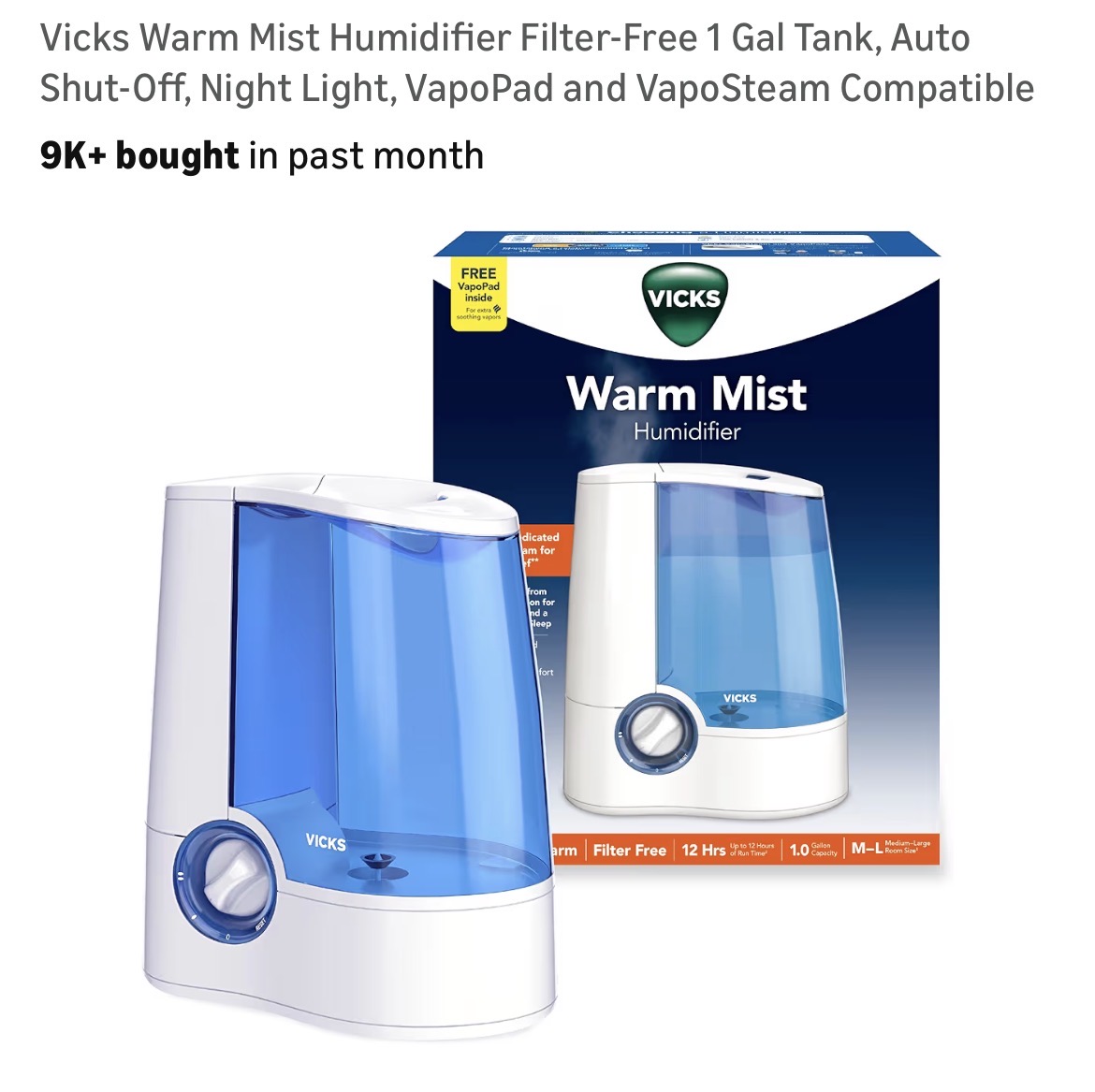 Vicks Warm Mist Humidifier Filter‑Free 1 Gal Tank #D120