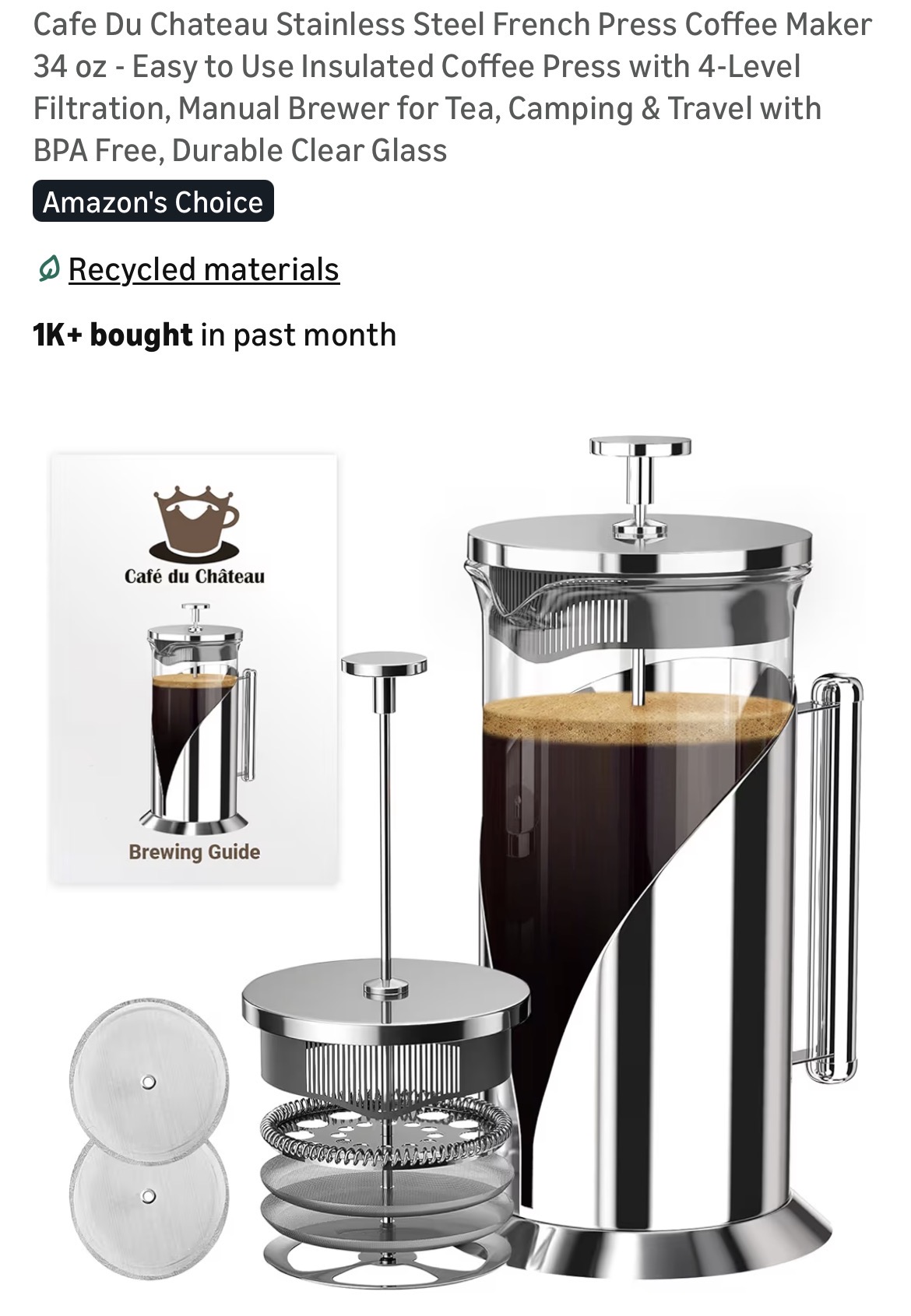 Cafe Du Chateau Stainless Steel French Press Coffee Maker #D132