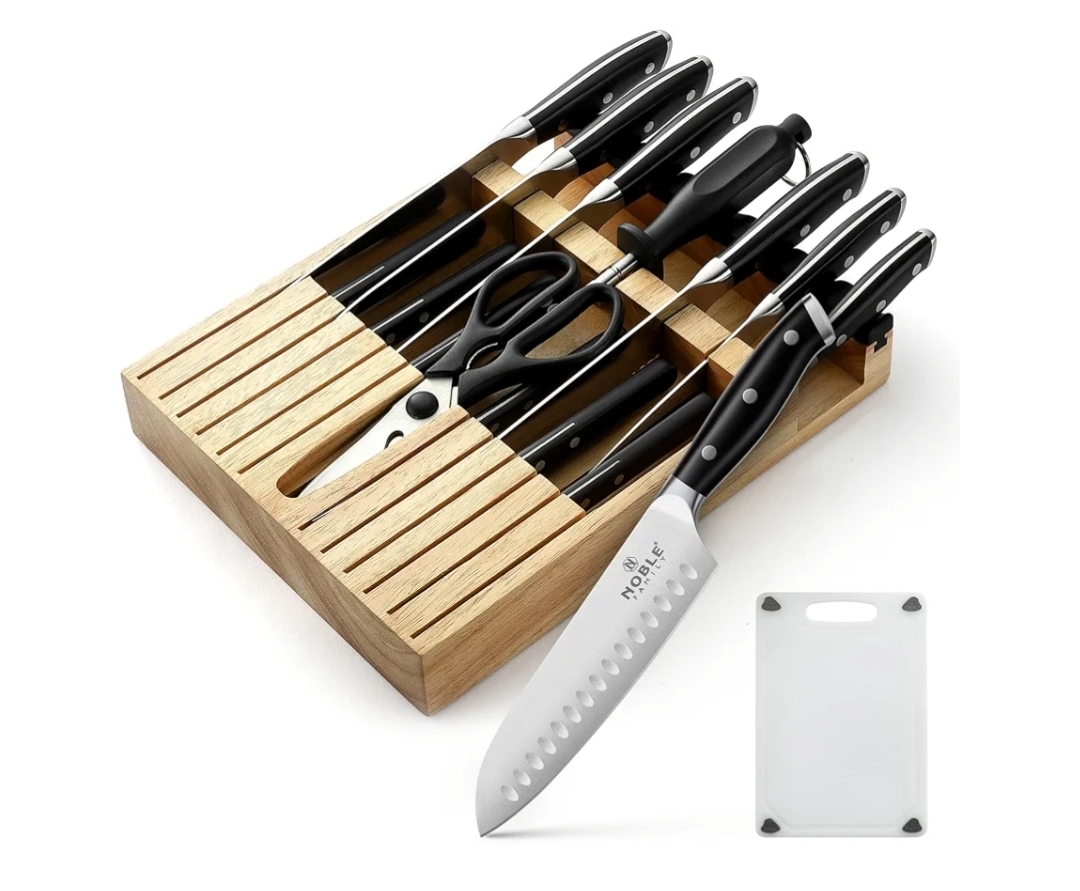 Ending On: 01/03/2026 07:47 Preview Time: 06:37 PMKnife Set with Block, N NOBLE FAMILY 16Pcs Kitchen Knives Drawer Organizer Set with Sharpener, Cutting Board, Anti-Slip Chef Knives Set with 6Pcs Steak Knives, Black