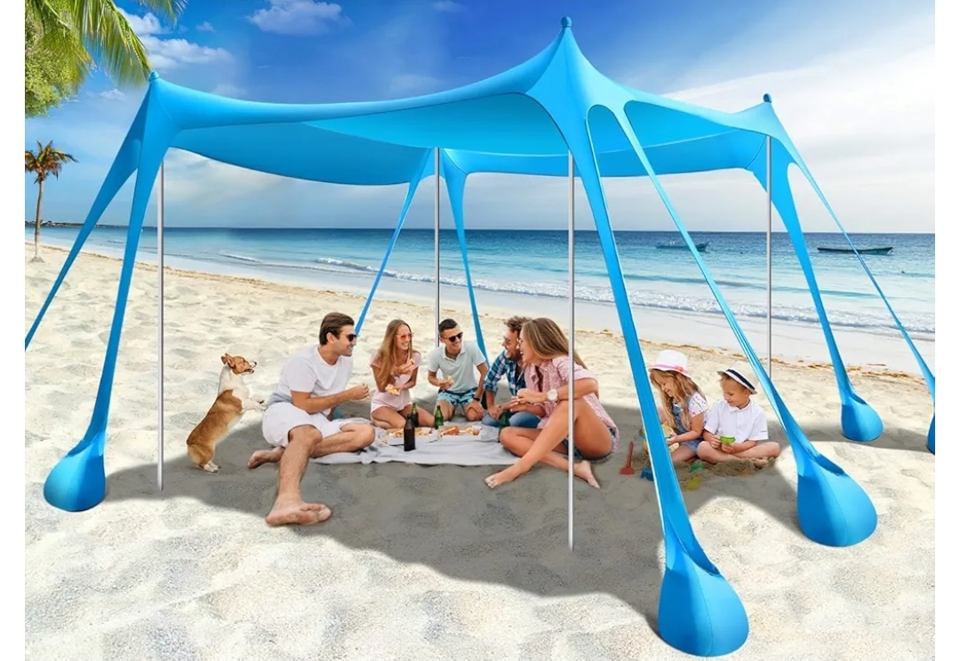 Ending On: 08/03/2026 07:27 Preview Time: 11:08 PMRhino Valley Beach Tent Shade Canopy UPF50+ Protection, 8 Sandbags, 4 Stability Poles, Outdoor Sun Shelter Umbrella for Sand, Camping, Fishing Essentials