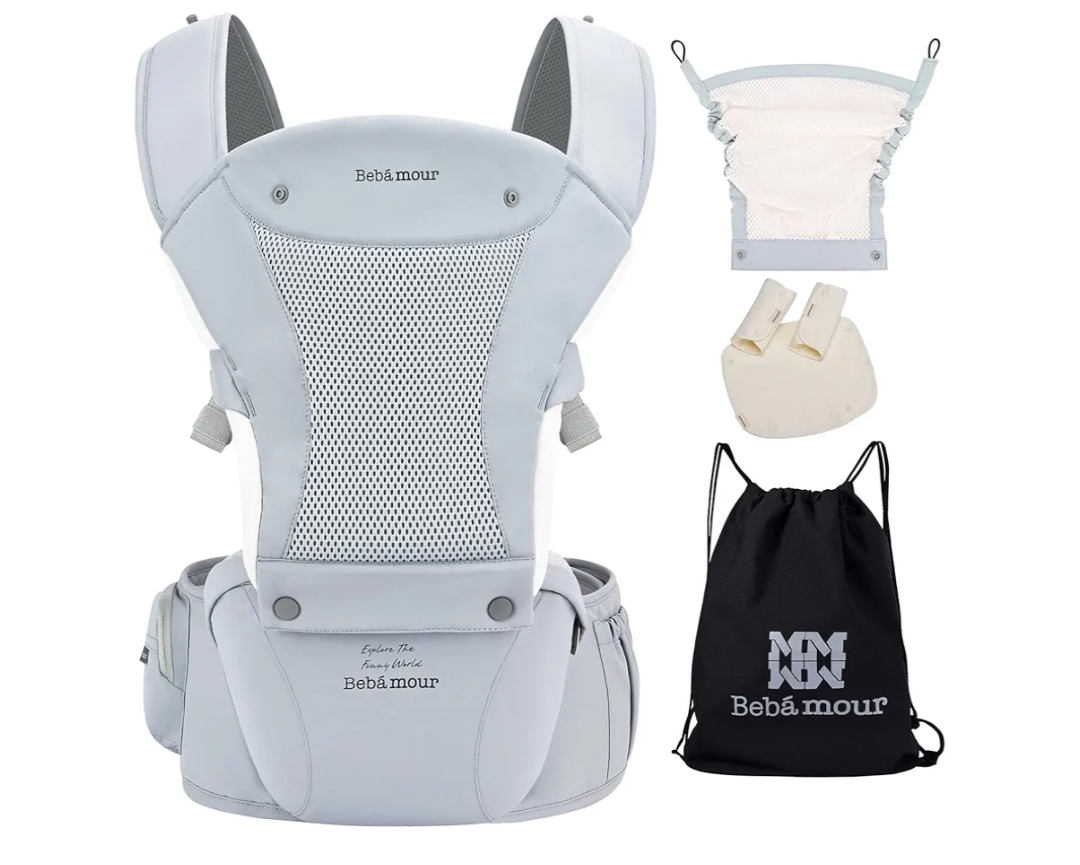 Ending On: 08/03/2026 07:28 Preview Time: 12:01 AMBebamour Baby Carrier with Hip Seat,All-Position Breathable Mesh Hip Seat & Carrier 0-36Months with Head Hood, 3 PCS Teething Pads, Waist Extender,Storage Bag & Pacifier Case (Blue)