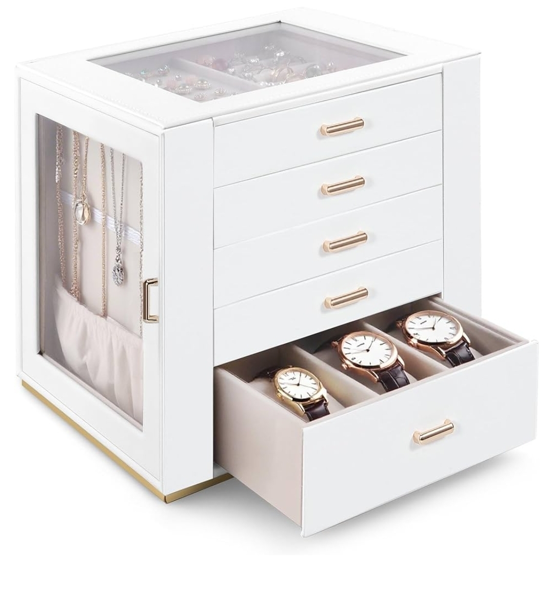 Ending On: 08/03/2026 07:31 Preview Time: 03:13 PMGUOER Jewelry Box 5 Layer for Women, Glass Lid Jewelry Organizer with 5 Drawers for Necklaces Rings Earrings Bracelets, Functional PU Leather Jewelry Storage Case Holder (White)