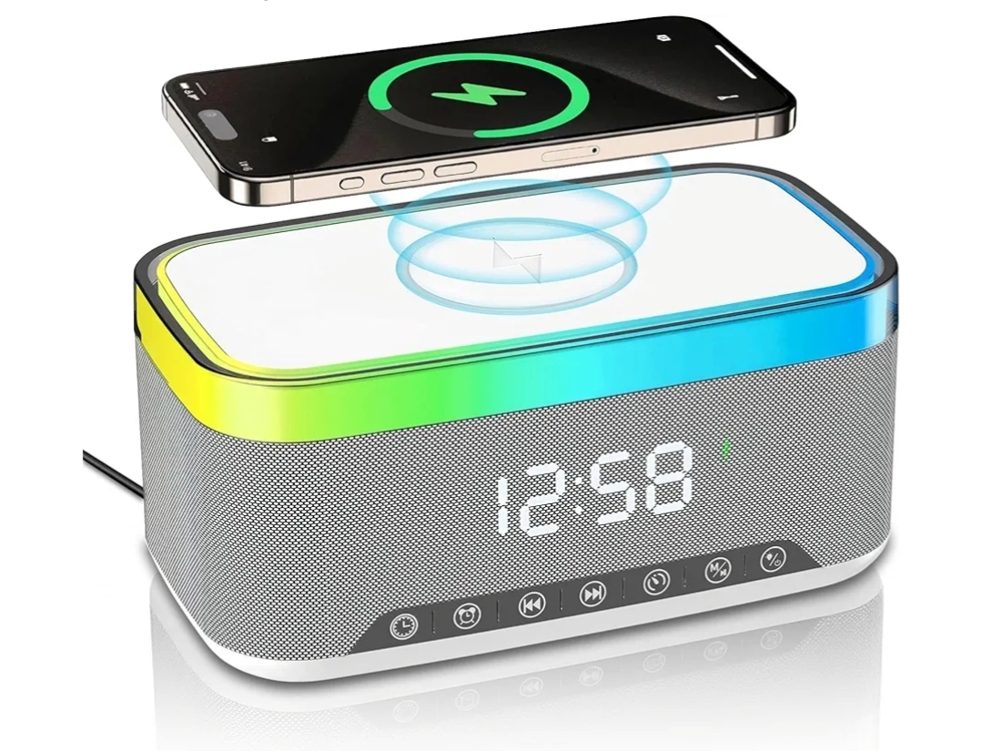 Ending On: 08/03/2026 07:32 Preview Time: 06:42 PMBluetooth Speaker with Wireless Charging & Digital Clock, LED Display, 15W Qi Charging Station, 2x10W Speakers, 6 Ambient Lights, BT5.3/AUX/TF/USB, for Home, Bedside, Travel, Birthday Presen (White)
