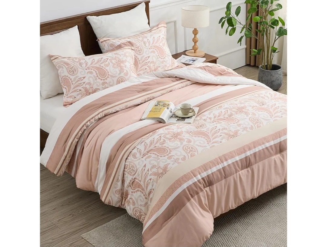 Ending On: 08/03/2026 07:38 Preview Time: 08:51 PMPANGUSHAN Cotton Comforter Set Queen Size, Paisley Striped Farmhouse Fluffy Comforter Bedding Set for Queen Bed, Luxury Bed Set, All Season, Down Alternative, 3Pcs, Brown/Pink