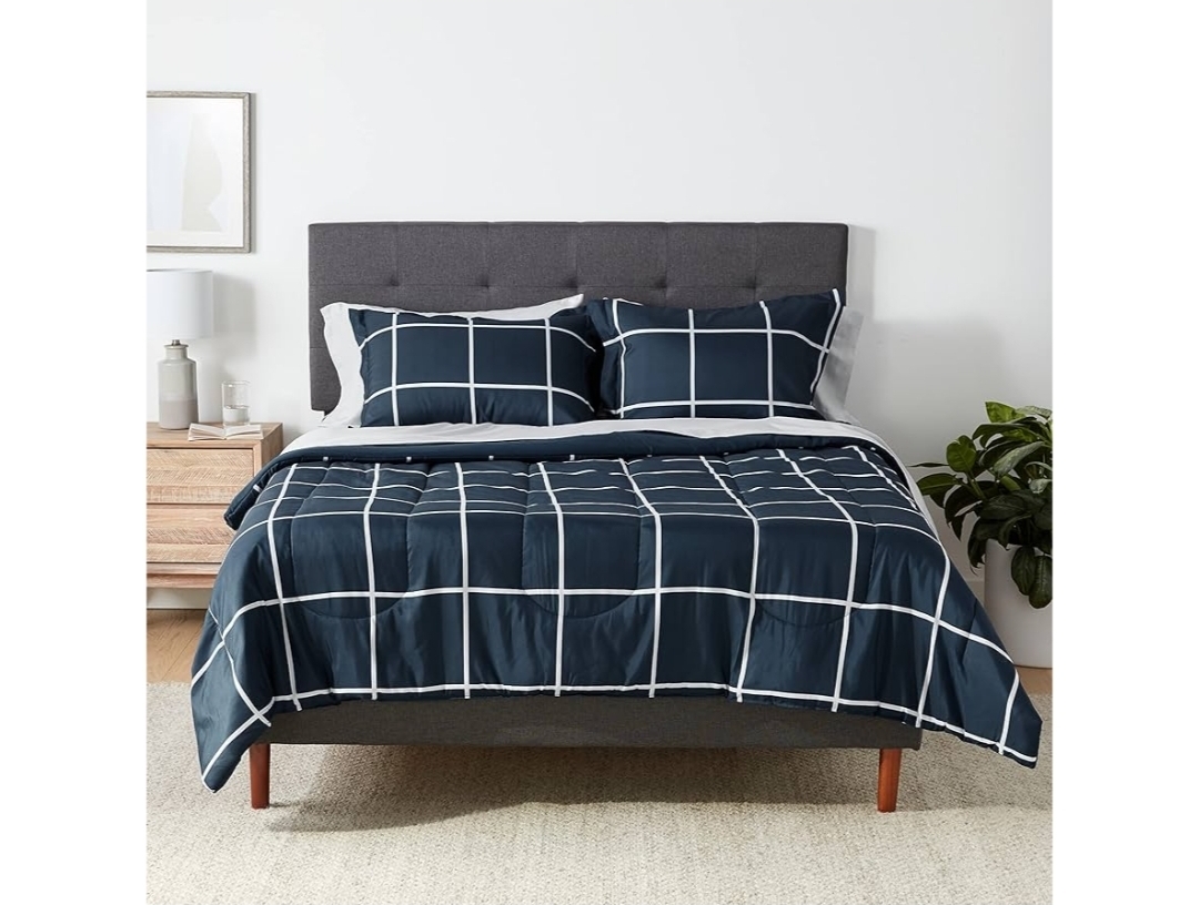 Ending On: 08/03/2026 07:42 Preview Time: 06:38 PMAmazon Basics twin/twin Comforter Set with Sheets, 7-Piece Navy with Grey Plaid Bedding, Lightweight Microfiber Bed-in-a-Bag