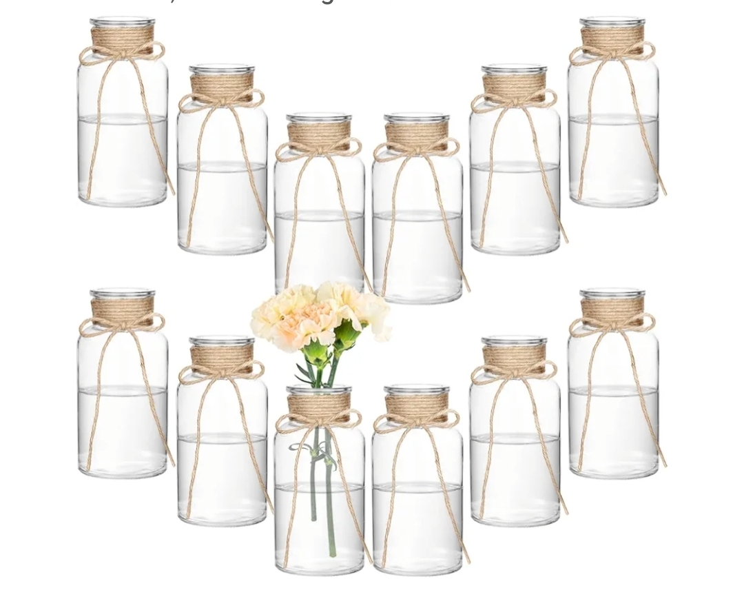 Ending On: 08/03/2026 07:45 Preview Time: 07:42 PMVintage Clear Glass Vases for Flowers – Set of 12 Decorative Cylinder Vases with Hemp Rope for Farmhouse Wedding Centerpieces, Reception Table Decorations, Home Decor, Floral Arrangements