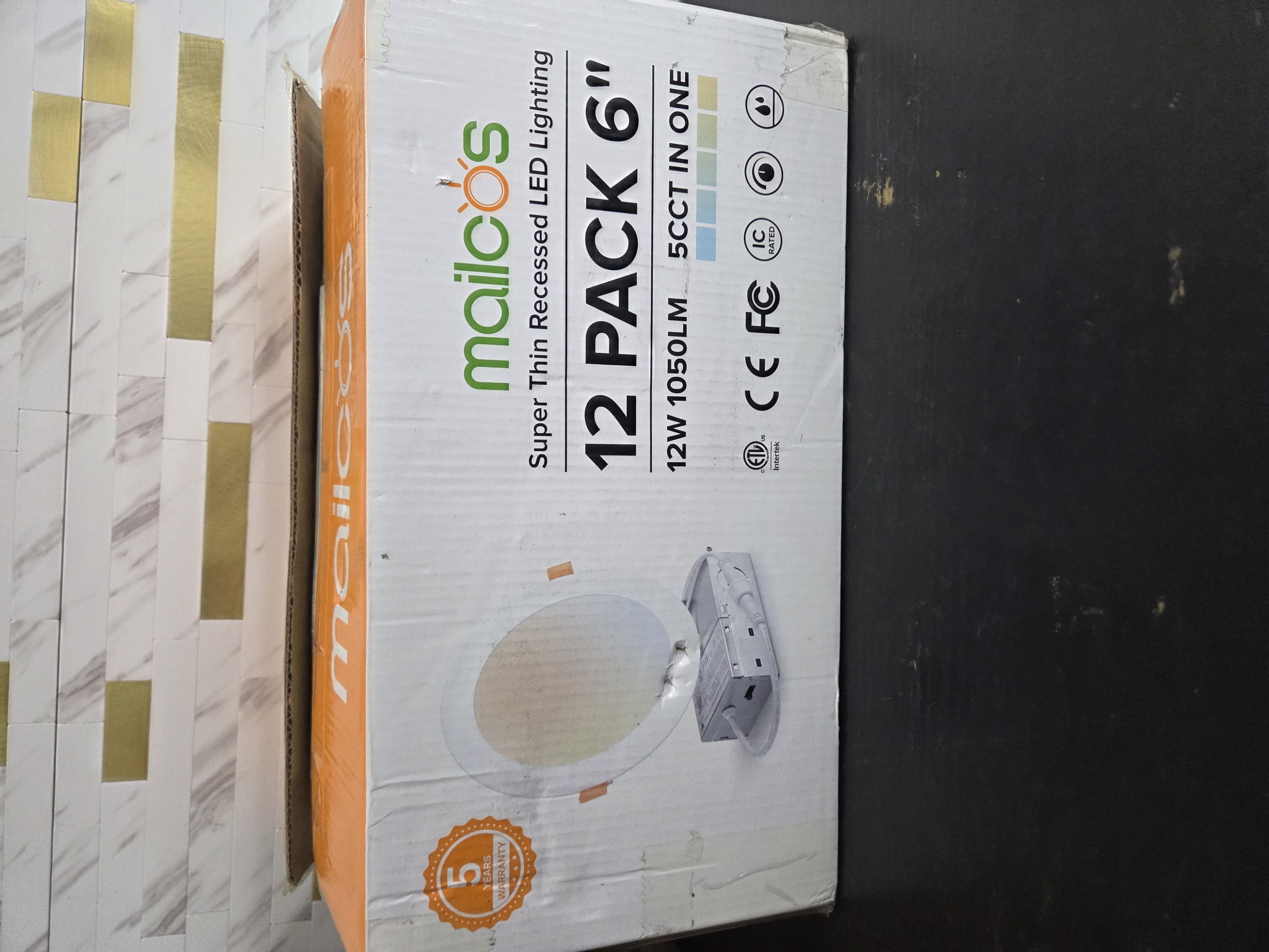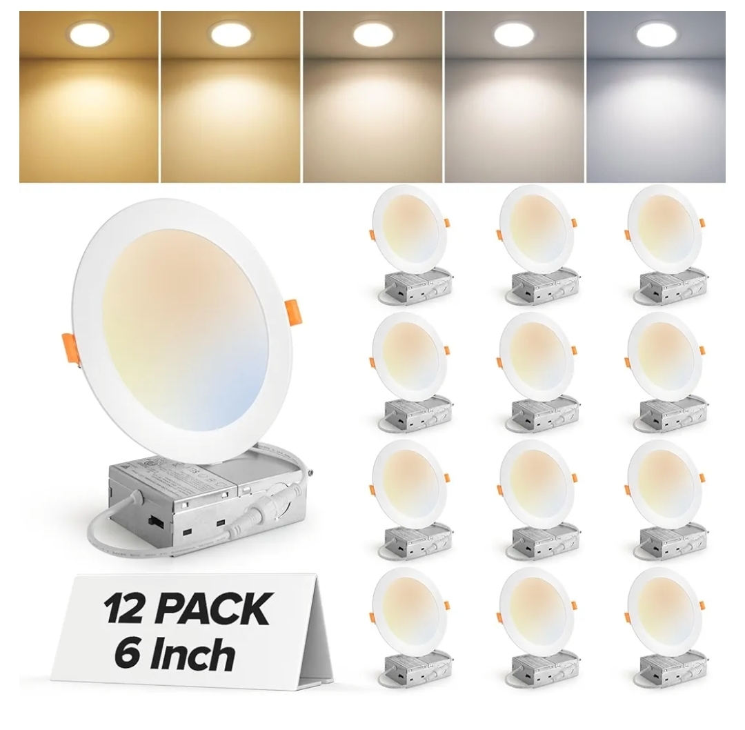 Ending On: 08/03/2026 07:45 Preview Time: 07:54 PMMAILCOS 12 Pack 6 Inch 5CCT Ultra-Thin LED Recessed Ceiling Light with Junction Box, 2700K-5000K Selectable, 1050LM High Brightness, Dimmable Canless Wafer Downlight, 12W 120V, ETL