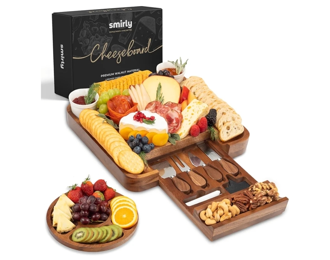 Ending On: 08/03/2026 07:47 Preview Time: 08:22 PMSMIRLY Charcuterie Boards Set, Large Cheese Board Set, Natural Walnut Wood Charcuterie Tray with Accessories - Housewarming Gifts New Home, Wedding & Bridal Shower Gifts for Women, Couples